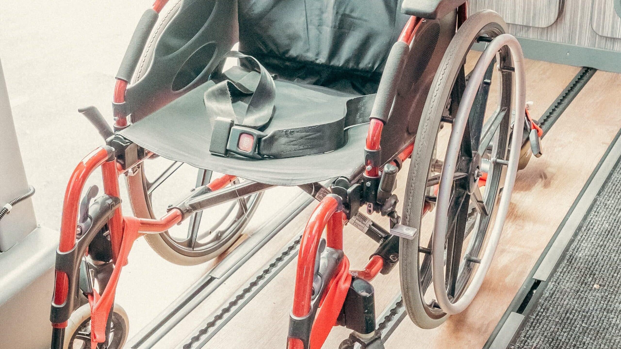 Les fauteuils roulants sont ancrés au sol (4 points de fixation, plus une ceinture de sécurité) et sont orientés face à la route.