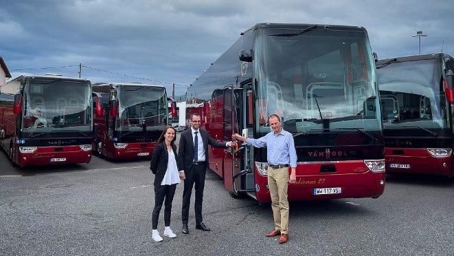 Premier autocar de France grande longueur accessible, ce sera Fabienne 10. la gamme Van Hool Astron T9 fait son entrée dans le parc de véhicule. Dotés de toilettes ultra accessible, frigo client, Micro-onde et prises en 220V, tout est réfléchi pour la satisfaction du client